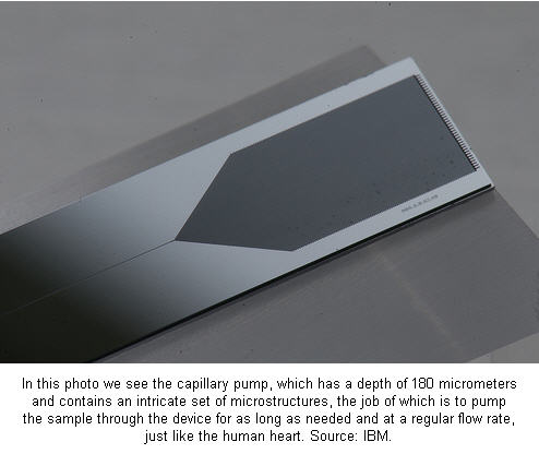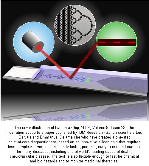 IBM公司最近開發出了一種基于芯片的,可以快速進行診療的醫療檢測系統,這種系統只需要少量的樣本便可以檢測出多種疾病。這套系統的推出,意味著醫生能 在病人心臟病發后馬上便能對病人進行檢測,并由此提高病人的救治生還率。這套系統可以利用毛細效應來對人體血液中的病源體進行檢測。