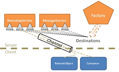 Flex中最重要的通信基礎(chǔ)設(shè)施是Destinations。 Destination是通信信道的服務(wù)器端終點(diǎn)。一個(gè)服務(wù)提供一個(gè) Destination,而客戶組件則通過這個(gè)Destination與這個(gè)服務(wù)相關(guān)聯(lián)。關(guān)聯(lián)的客戶組件可以向Destination發(fā)送和讀取消息。 Destinations可以由Factories創(chuàng)建。