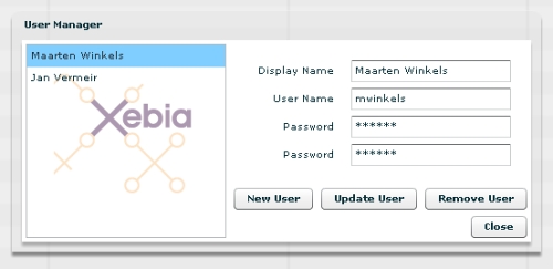 怎樣使用這個(gè)通用的類包呢?我們來看一個(gè)例子,這個(gè)例子中我們要實(shí)現(xiàn)的是在第二個(gè)解決方案中提到的管理User對(duì)象的實(shí)例。下面這段MXML代碼定義了 一個(gè)PopUpDialog,這個(gè)PopUpDialog可以用來編輯系統(tǒng)中Users的詳細(xì)信息。這個(gè)對(duì)話框的外觀就如左圖所示。實(shí)例變量 “manager”為User領(lǐng)域類型初始為一個(gè)DomainInstanceManager實(shí)例。界面中包含了所有捆綁到這個(gè)manager的list 屬性的用戶的列表。它顯示了用戶的displayName值。