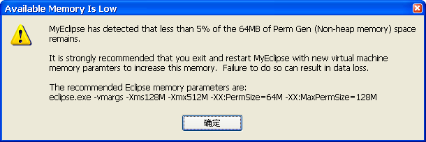 MyEclipse內(nèi)存不足之JVM內(nèi)存淺談如果沒(méi)有進(jìn)行設(shè)置的話,在使用MyEclipse的經(jīng)常出現(xiàn)如下圖所示內(nèi)存不足的提示。