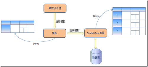 MultiRow的主框架如下圖所示。首先,通過集成設(shè)計(jì)器設(shè)計(jì)適合于業(yè)務(wù)需求的模板,并把模板應(yīng)用于MulitRow控件,之后把MultiRow綁定到相關(guān)的數(shù)據(jù)源(或者直接使用MultiRow的非綁定模式),這樣數(shù)據(jù)源的每一條數(shù)據(jù)記錄將會(huì)根據(jù)所設(shè)計(jì)的模板進(jìn)行呈現(xiàn)。由于MultiRow支持.NET標(biāo)準(zhǔn)Windows窗體數(shù)據(jù)綁定模型,因此,大多數(shù)情況下只需設(shè)置DataSource屬性即可。