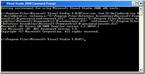 csc.exe /out:D:\HelloWorld.exe D:\HelloWorld.cs /reference:"C:\Program Files\Reference Assemblies\Microsoft\Framework\v3.0\presentationframework.dll" /reference:"C:\Program Files\Reference Assemblies\Microsoft\Framework\v3.0\windowsbase.dll" /reference:"C:\Program Files\Reference Assemblies\Microsoft\Framework\v3.0\presentationcore.dll"