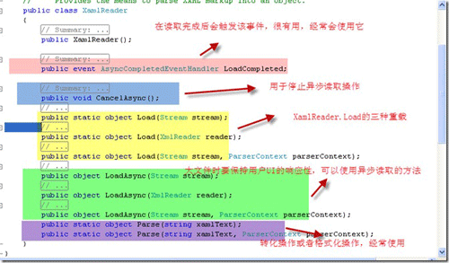 XamlReader類除了定義Load的實時加載之外,也定義了異步方法,可以異步解析XAML中的內容。我們可以在XamlReader對象的實例里調用它們。如果在讀取一個大文件時要保持用戶UI的響應性,就可以使用異步讀取的方法。和異步讀取方法匹配的還有一個CancelAsync方法,用于停止讀取操作。XamlReader 還定義了LoadCompleted事件,在讀取完成后會觸發該事件,那么我們就可以把讀完后要做的事情都在這里進行處理。