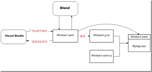 上圖就是現在的WPF和Silverlight程序的開發模式,這兩類人可以分開來工作,他們都可以對Window1.xaml進行修改和加載,所以這樣就使分工更專業了,由于大家專注于某一個方面,分工協作的同時,質量和效率也逐漸提高了。