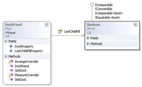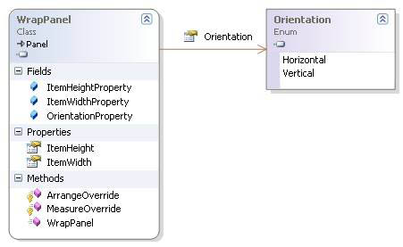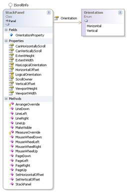 StackPanel就是將子元素按照堆棧的形式一一排列,通過設(shè)置面板的Orientation屬性設(shè)置了兩種排列方式:橫排(Horizontal默認(rèn)的)和豎排(Vertical)??v向的StackPanel默認(rèn)每個(gè)元素寬度與面板一樣寬,反之橫向亦然。如果包含的元素超過了面板空間,它只會截?cái)喽喑龅膬?nèi)容。 元素的Margin屬性用于使元素之間產(chǎn)生一定得間隔,當(dāng)元素空間大于其內(nèi)容的空間時(shí),剩余空間將由HorizontalAlignment和VerticalAlignment屬性來決定如何分配。其他屬性,大家可以看看如下類圖: