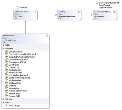 通常用戶界面中的內(nèi)容比計(jì)算機(jī)屏幕的顯示區(qū)域大,大出的部分就會破壞原有的布局。利用 ScrollViewer 控件可以方便地使應(yīng)用程序中的內(nèi)容具備滾動(dòng)功能。這樣大出的部分就可以正常顯示出來了。常用屬性、事件和繼承關(guān)系見下面類圖: