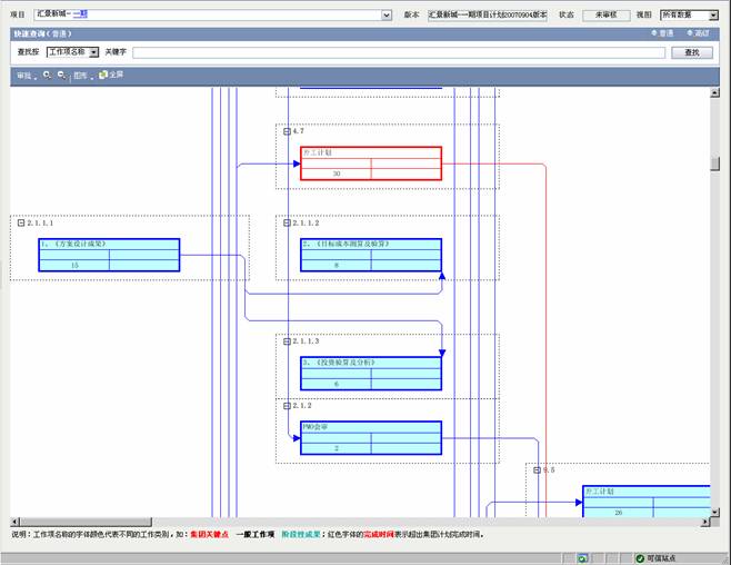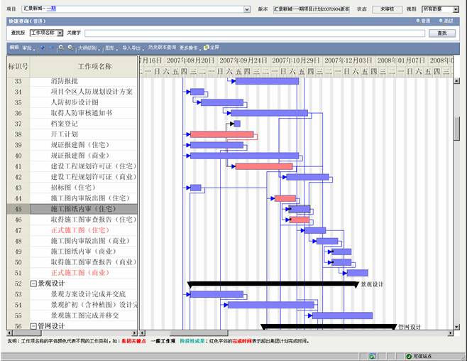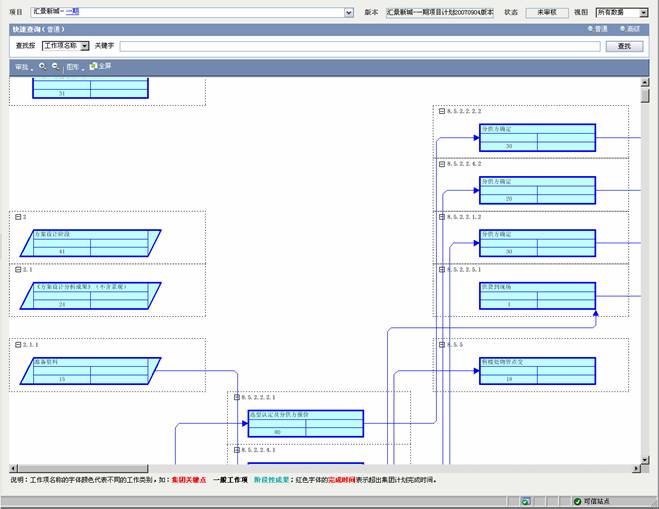 系統廣泛應用各種先進的項目管理技術實現項目的動態管理,包括項目編碼體系(WBS) 、甘特圖 (Gantt Chart) 、關鍵路徑法 (CPM)等。