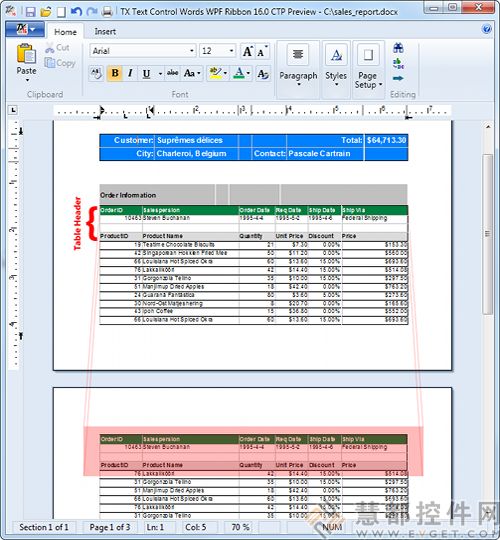 表可以用于展示報告中大量的數據,表上任何一頁的最大長度,只能是該頁面的最大長度(減去頁邊距,頁眉和頁腳),每次分頁時就需要分表。有了TX Text Control .NET v16.0后,分頁時表中的任何一行都可以被自動添加到每個表上,這確保了每一頁表無論多長都有表頭。