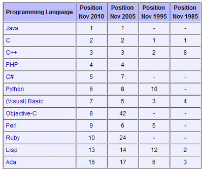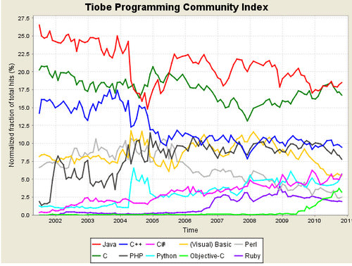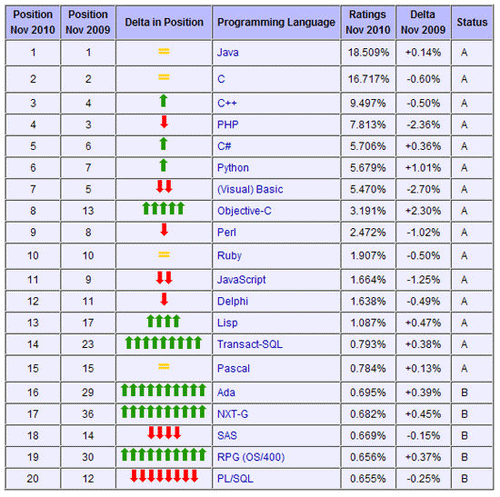 概述:TIOBE編程語言排行榜的11月榜單近日發(fā)布。從榜單上可以看出,在過去很長一段時間內都呈現(xiàn)持續(xù)增長趨勢的Objective-C從上個月開始所占份額第一次有所下降,11月份相比10月又下降了0.5%。這是不是說明iPhone熱潮已經(jīng)開始消退了呢?樂高的Mindstorms編程語言NXT-G首次躋身躍入排行榜的前20名,是11月排行榜一個亮點。同時Google的Go語言突然跌出前20名,Visual Basic由曾經(jīng)的排行榜之首到本月的跌至低谷,頹廢明顯,也是11月排行榜值得關注的地方。