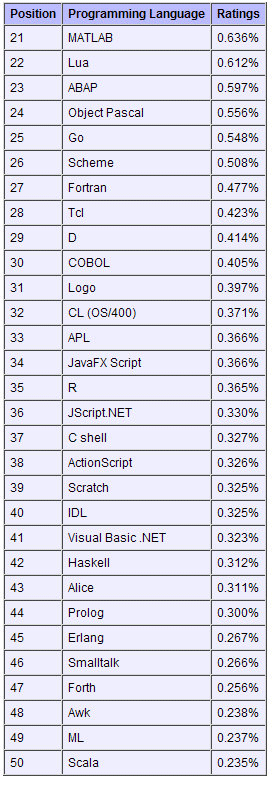 這個榜單本身采集的是英文世界的數(shù)據(jù),雖然在反映趨勢上有較高的參考意義,但與中國的實際情況不完全符合,此外,這張采樣本身也有相當大的局限性。《程序員》2010年8月刊的圓桌討論“什么是最美麗的編程語言”中,許多專家也談到了這一點。