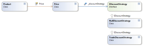 這個(gè)接口就用來實(shí)現(xiàn)不同打折的策略,這是策略模式的一種應(yīng)用。這個(gè)模式允許我們在運(yùn)行的時(shí)候更改不同的算法實(shí)現(xiàn)。在本例子中,Price類將會(huì)根據(jù)不同的產(chǎn)品來實(shí)現(xiàn)不同的打折策略。在我們之前的那個(gè)Smart UI例子中,其實(shí)這個(gè)打折的算法我們已經(jīng)寫了,但是沒有分離出來,導(dǎo)致了每次加一個(gè)打折的算法的策略,程序就需要改動(dòng),重新編譯,部署。也就是說打折的部分是個(gè)變化點(diǎn),我們應(yīng)該分離出來的。