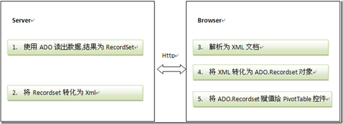 對于后兩種數據源,我沒有試過,就不說了。下面只以關系數據庫為例。由于我是在IE中使用PivotTable控件的,所以只能使用離線數據。基本的思路是