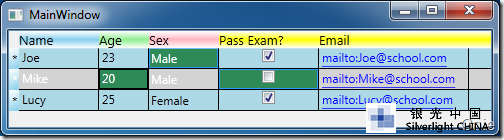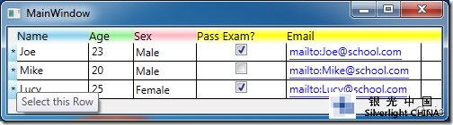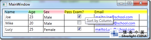 其效果如下圖所示,Name、Age、Sex 列會按各自的樣式顯示。未定義樣式的Pass Exam 和Email 列將按<DataGrid.ColumnHeaderStyle>全局定義顯示,并且當鼠標移置到這兩列上方時會有"Sort by Column"提示信息。