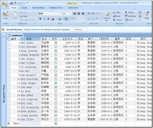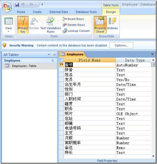首先,我們使用Microsoft Access 2007數(shù)據(jù)庫,創(chuàng)建一個數(shù)據(jù)表,命名為Employees,創(chuàng)建一些字段,給每個字段指定數(shù)據(jù)類型。請看下圖: