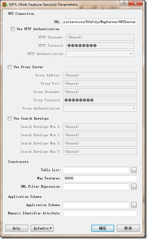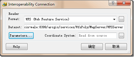ArcGIS中對WFS訪問客戶端的支持是基于FME來實現的,所以新建WFS連接的界面的風格與FME基本一致,如下圖所示: