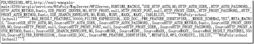 當使用Interoperability模塊新建了一個WFS連接后,ArcGIS會在目錄"%userprofile%\AppData\Roaming\Safe Software\Interoperability"中自動生成一個后綴為".fdl"的WFS連接文件。將該文件使用文本編輯器打開,可以發現該文件其實就是存儲了所有用于定義該WFS連接的相關參數: