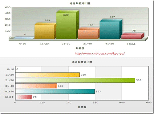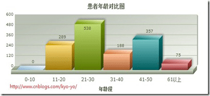 2 chart_YearAgeChartTable.setDataXML("<chart caption='患者年齡對比圖' formatNumberScale='0' xAxisName='年齡段' yAxisName='患病數(shù)'><set label='0-10' value='0' /><set label='11-20' value='289' /><set label='21-30' value='538' /><set label='31-40' value='188' /><set label='41-50' value='357' /><set label='61以上' value='75' /><styles><definition><style name='titlefont' type='font' size='14'/><style name='axisfont' type='font' size='12'/></definition><application><apply toObject='Caption' styles='titlefont' /><apply toObject='xAxisName' styles='axisfont' /><apply toObject='yAxisName' styles='axisfont' /><apply toObject='DATALABELS' styles='axisfont' /></application></styles></chart>");