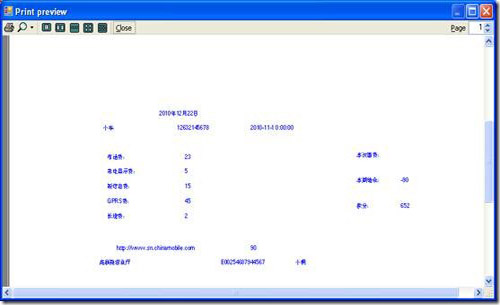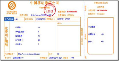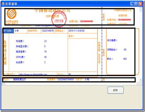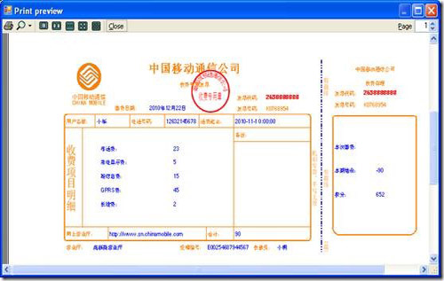 如果你已經(jīng)熟悉了MultiRow的結(jié)構(gòu),你肯定知道MultiRow有三種Section,ColumnHeader,Row以及ColumnFooter,前面演示的示例只使用了Row,沒有ColumnHeader和ColumnFooter,下面創(chuàng)建的一個模板,是一個移動通信的發(fā)票,有ColumnHeader和ColumnFooter,這個示例將會在后續(xù)的博文中詳細講述如何使用MulitRow來制作。運行起來的效果如下所示: