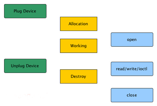 如上圖所示,最左邊的綠色框圖表示實際設備的插拔動作,中間黃色的框圖表示內核中設備對象的生存周期,右邊藍色的框圖表示用戶程序系統調用的順序。如果用戶程序正在訪問的時候設備突然被拔掉,驅動程序里的設備對象是否立刻釋放呢?如果立刻釋放,用戶程序執行的系統調用一定會發生內存非法訪問;如果要等到用戶程序close之后再釋放設備對象,我們應該怎么來實現?kref就是為了解決類似的問題而生的。