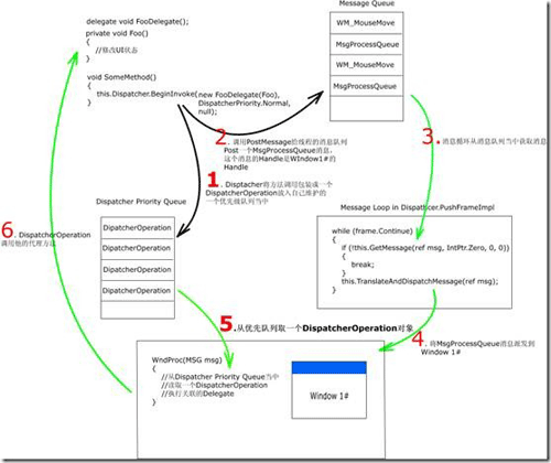 WPF也是通過BeginInvoke來解決的,而Wpf的BeginInvoke是在Dispatcher上面暴露了,因為整個消息系統都是Dispatcher在協調。從上面圖可以看出Dispatcher在調用BeginInvoke之后所經歷的流程,最終是什么時候Foo()被真正執行的。