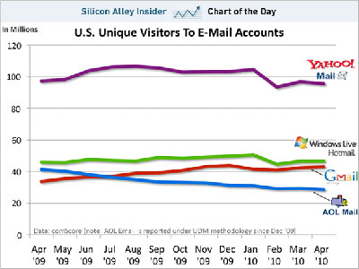 4月,谷歌Gmail用戶數量同比增長27.相比之下,AOL用戶數量下滑20%.