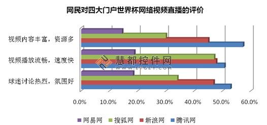 小組賽期間,賽事視頻直播最受網民關注,數據顯示,52%網民使用騰訊網收看世界杯網絡視頻直播,超出其他門戶網站。在“視頻內容豐富,資源多”,“視頻播放流暢,速度快”,“球迷討論熱烈,氛圍好”三項指標上,騰訊網都以絕對優勢領先其他門戶網站。
