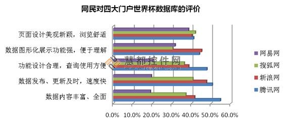 騰訊網世界杯賽事數據庫也贏得了網民的認同,46%網民表示,小組賽期間通過騰訊網來查詢世界杯賽事數據。在四大門戶數據庫使用調查中,在數據內容豐富、全面,數據發布、更新及時、速度快,功能設計合理、查詢使用方便等幾項核心指標上,騰訊網均名列第一,得到網民認可。