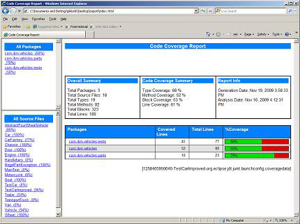HTML報告顯示了基于Eclipse報告所提供的相同類型的信息,但是呈現的格式卻是HTML的。這些報告能夠發揮一定程度的作用,因為它們為在獨立于Rational Application Developer之外去分析覆蓋率數據提供了一種有效的方法,您可以與團隊的其他成員一起分享,或者將其發布到一個網站上以方便查看。