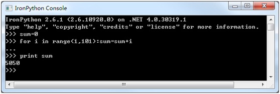 舉個(gè)簡(jiǎn)單的例子,圖 2所示為使用IronPython[2]編程計(jì)算“1+2+……+100”的屏幕截圖,我們可以快速地輸入一段完成累加求和的代碼,然后馬上就可以看到結(jié)果: