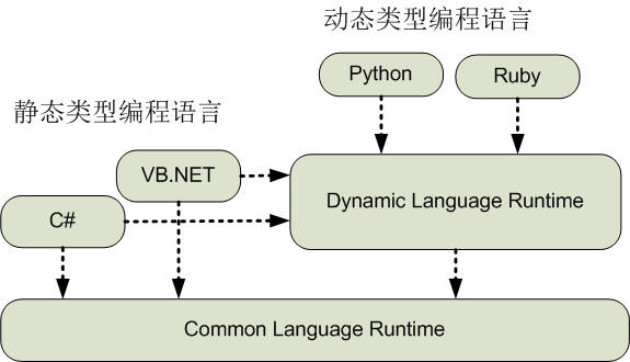 DLR運(yùn)行于CLR之上,提供了一個(gè)動(dòng)態(tài)語(yǔ)言的運(yùn)行環(huán)境,從而允許Python、Ruby等動(dòng)態(tài)語(yǔ)言編寫(xiě)的程序在.NET平臺(tái)上運(yùn)行,同時(shí),現(xiàn)有的.NET靜態(tài)類型編程語(yǔ)言,比如C#和Visual Basic,也可以利用DLR而擁有一些動(dòng)態(tài)編程語(yǔ)言的特性。