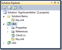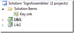 舉個例子,假設一個解決方案中具有兩個項目:Lib1和Lib2?,F(xiàn)在我們需要使用“同一個Key File”對Lib1和Lib2進行簽名,Lib1、Lib2和Key File(Key.snk) 對應的目錄結構如右圖所示:Key.snk和Lib1和Lib2處在相同的目錄下面。