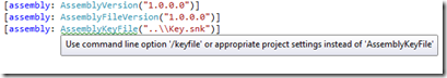 但是,這并不是一種推薦的Key File指定方式。當你添加了AssemblyKeyFileAttribute特性的時候,Visual Studio會有如下一個警告:“Use command line option '/keyfile' or appropriate project settings instead of 'AssemblyKeyFile'”。提示你采用另外兩種方案:命令行或者項目設置。