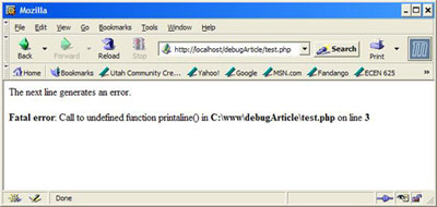 也可以用出錯消息為自己服務(wù),因為它們會顯示拋出或生成錯誤的正確代碼行。這樣,調(diào)試就變成在瀏覽器上查看生成的錯誤所顯示的行號,并在代碼中檢查這一行。稍后,將會看到 PHPEclipse 插件通過即時地給語法錯誤加下劃線并在保存文件時用紅色 “x” 標注語法錯誤,可在開發(fā)和調(diào)試過程中提供極大的幫助。