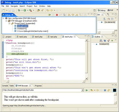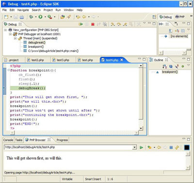 使用調(diào)試器,可以設(shè)置斷點并查看 PHP 代碼到所設(shè)斷點之前的瀏覽器輸出。然后可以繼續(xù)代碼的執(zhí)行并查看到下一斷點之前的瀏覽器輸出,然后再到下一個,直到 PHP 腳本完成。