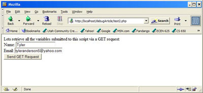 您可能會非常容易地發(fā)現(xiàn)清單 2 中的 bug!您很棒!但請注意這是一個非常簡單的腳本,只是作為使用 print 語句進行調(diào)試而展示的一個例子而已。這個腳本只是提取 GET 請求中的所有變量,如果有,就把它們顯示在瀏覽器上。還提供了一個表單,用 GET 請求向服務(wù)器發(fā)送變量以進行測試。請看輸出,如圖 2 所示。