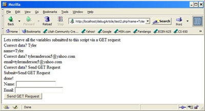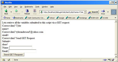 現(xiàn)在單擊 Send GET Request 按鈕,請注意只有 $_GET 請求的鍵顯示在瀏覽器上,而正確的值都沒顯示。可以在循環(huán)中放一個 print 語句,檢驗在 foreach 循環(huán)中每個元素中是否確實存在數(shù)據(jù)。請參閱清單 3。