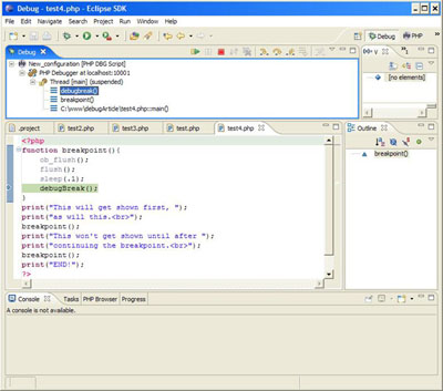breakpoint() 函數(shù)會把緩沖的輸出和其他緩沖的數(shù)據(jù)刷新到 Web 瀏覽器。對 sleep(.1) 的調(diào)用是必需的,這樣代碼中止于 debugBreak() 之前,服務(wù)器才有足夠的時間把數(shù)據(jù)刷新到 Web 瀏覽器,這個函數(shù)是前面下載的 PHP 調(diào)試器擴展的內(nèi)部函數(shù)。這樣,調(diào)用 breakpoint() 會把 HTML 塊、print() 和 echo() 語句的數(shù)據(jù)刷新到瀏覽器,然后中止代碼執(zhí)行。
