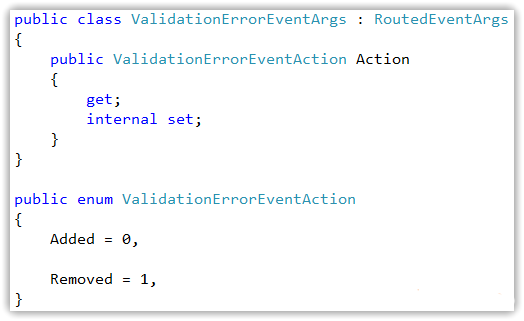 BindingValidationError事件定義在FrameworkElement中,通過它可以接收到ValidationErrorEventArgs類型的參數,而在ValidationErrorEventArgs中定義了一個很重要的屬性Action,它的定義如下: