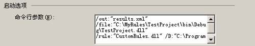 2、將命令行參數(shù)修改成:out:"results.xml" /file:"C:\MyRules\TestProject\bin\Debug\TestProject.dll" /rule:"CustomRules.dll" /D:"C:\Program Files\Microsoft FxCop 1.36"