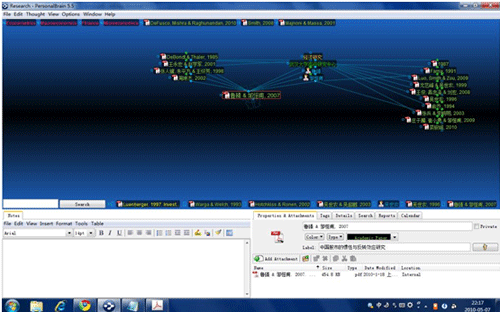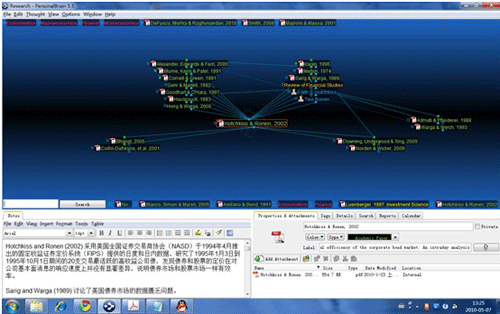 可以看到,目前的關注焦點在 Hotchkiss & Ronen, 2002 這篇文章上,這在 PersonalBrain 中被稱為一個 Thought。每個 Thought 都可以添加無數附件,我只把這篇文章的 pdf 文件放入了附件,只要點擊 Thought 內的 pdf 圖標,論文就會自動打開。左下角是這個 Thought 的附注,支持富文本格式(RTF),我讀這篇文章后簡單地記錄了一些當時的想法。