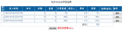 我們可以在第一行中實現(xiàn)計算運費的運算。然后點增加明細(xì)按鈕時,調(diào)用jQuery 的clone(true)函數(shù),建立第一行的副本對象插入到表格下方,由于使用clone(true)可以復(fù)制對象的事件處理函數(shù),所以每行中文本框的onblur事件和運費計算函數(shù)也被成功復(fù)制,不需再做處理。大大減輕了工作量。