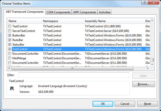 在Visual Studio的工具箱中點擊鼠 標右鍵,選擇右鍵菜單中的 【Toolbox Items】菜單項,在彈出的【Choose Toolbox Items】對話框中,選擇【.NET Framework Components】Tab頁,點擊【Browse】按鈕指定TX Text Control .NET 的安裝路徑(例如:C:\Program Files\The Imaging Source Europe GmbH\TX Text Control 16.0.NET for Windows Forms\Assembly\),然后選擇TXTextControl.Windows.Forms.dll文件。
