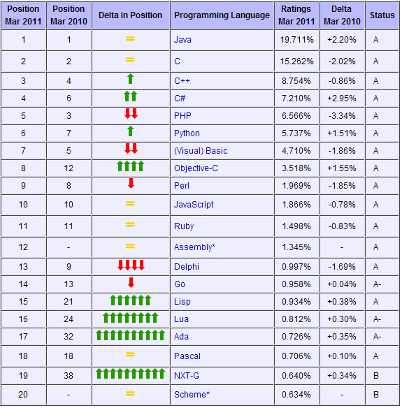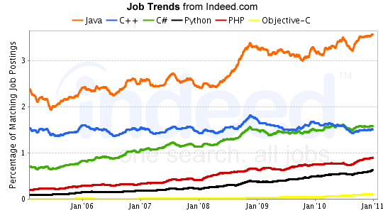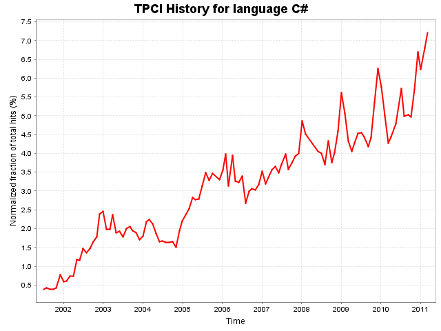 TIOBE剛剛公布了2011年3月編程語言排行榜。與上月相比,本月排名中最引人注目的是C#連升兩級,超過了PHP和Python,第一次排名第四,而且市場占有率也逐漸逼近C++。它也是近年來前十語言中一直保持上升趨勢的。美國職位搜索網(wǎng)站Indeed的趨勢也印證了這一點,C#目前的職位已經(jīng)超過C++。
