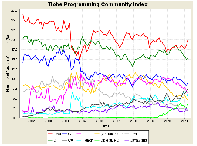 概述:TIOBE剛剛公布了2011年3月編程語言排行榜。與上月相比,本月排名中最引人注目的是C#連升兩級,超過了PHP和Python,第一次排名第四,而且市場占有率也逐漸逼近C++。它也是近年來前十語言中一直保持上升趨勢的。美國職位搜索網(wǎng)站Indeed的趨勢也印證了這一點,C#目前的職位已經(jīng)超過C++。