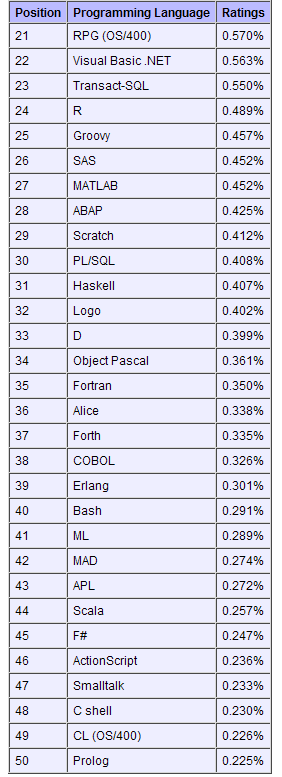 大家都非常關注的Java平臺上的語言中,Groovy排名最高,Scala其次(但低于Erlang和Haskell、D),其他的未進榜。