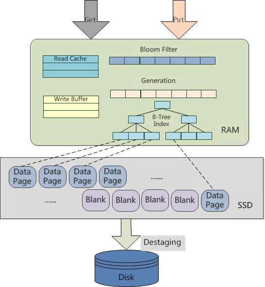 插入的時候,先寫到write buffer里面,當(dāng)buffer到達(dá)一個臨界值的時候?qū)⑵渌⒌絊SD上,當(dāng)SSD到達(dá)一個臨界值的時候,將其踢出并移到硬盤,當(dāng)然整個過程Bloom Filter也要保持一致。
