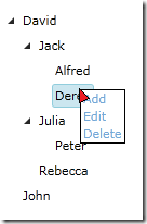 第二步,彈出右鍵菜單,選中節(jié)點(diǎn)selectedNode的信息是必需的,它作為引用被用來(lái)編輯TreeViewItem、添加子節(jié)點(diǎn)到TreeViewItem和刪除TreeViewItem。