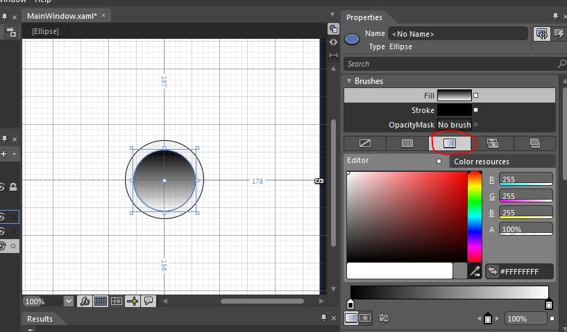 4.選擇某一個圓,點擊屬性Properties,選擇Brushes,點擊Fill,選擇圖4中紅線圈出的部分(Gradient Brush),然后在顏色板里更改橢圓的填充顏色,兩個橢圓填充顏色的方法相同。最后配出的橢圓顏色如圖5