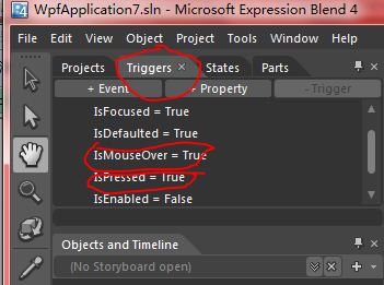 8.接下來給按鈕添加MouseOver放大效果,Pressed縮小效果,選擇圖9中的Triggers,然后選擇IsMouseOver=True