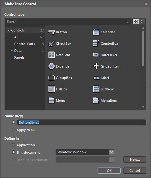 6.第五步結束后,會跳出一個窗口,如圖7 ,選擇Button,然后Name一欄自己命名,Define in一欄默認,然后點擊OK。